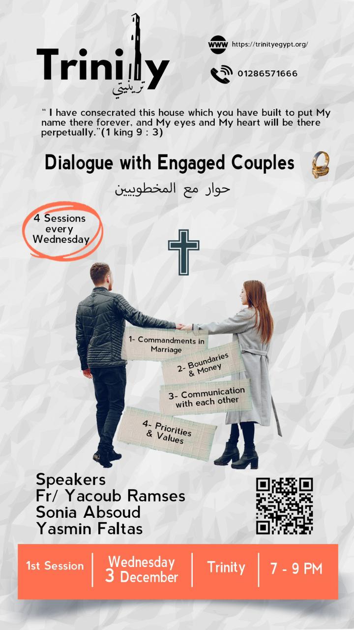 Date Wednesday, 3Dec25 Sessions 4 Time 7pm to 9pm Location Trinity Building Fees Free 💍✨ Before saying “Yes”…There are always questions about love and commitment!That’s why Trinity Center invites you to:✨ Dialogue with Engaged couples ✨ 🗓 Every Wednesday in December3 – 10 – 17 – 24 | 🕖 7–9 PM📍 Trinity Building 💛 Free