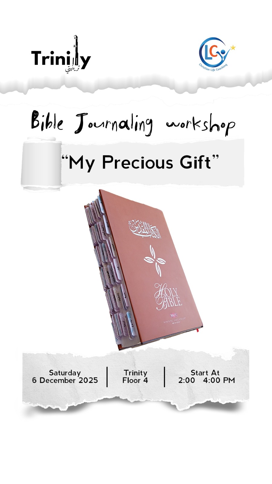 Date Saturday, 6Dec25 Sessions 1 Time 2pm to 4pm Location Trinity Building Fees 100 L.E https://trinityegypt.org/wp-content/uploads/2025/11/Bible-Journaling.mp4 🌟Join Us for an Inspiring “Bible Journaling” Workshop! 🌟“My Precious Gift” In Collaboration with Christian Life Coaching (CLC) 🙌📖 🔑 What You’ll Explore:Discover the spirit of Expression in the Bible and create “My Precious Gift.”The power of building servants
