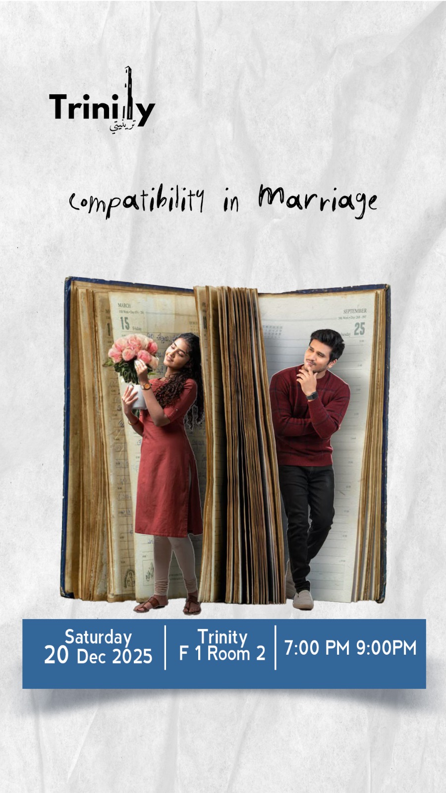 Date Saturday, 20Dec25 Sessions 1 Time 7pm to 9pm Location Trinity, 1st Floor Fees 200 L.E 🌟 Discover the Secrets to a Successful Marriage! 🌟 ✨ Join us for an exclusive event: “Compatibility in Marriage”! ✨ with Eng. Samih Sami 🗓 Date: Saturday, December 20🕖 Time: 7:00 PM – 9:00 PM🏢 Location: Trinity Building, 1st